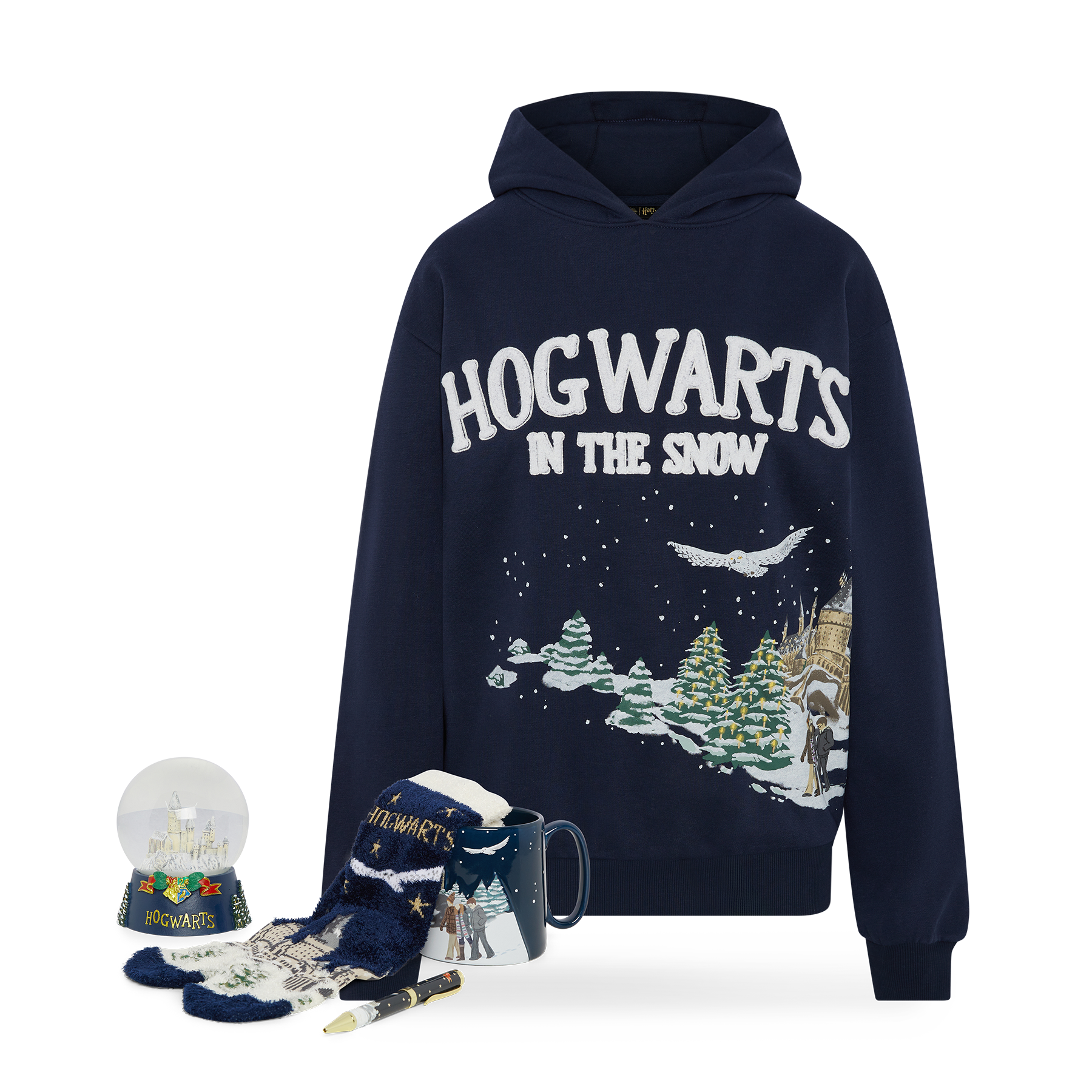 This exclusive collection includes a cozy hoodie featuring signature Hogwarts in the Snow artwork, a glittering snow globe of the castle surrounded by a flurry of snowflakes, and a matching mug and socks set—perfect for curling up by the fire. A festive pen completes the bundle, ideal for jotting down holiday wishes or magical to-do lists.