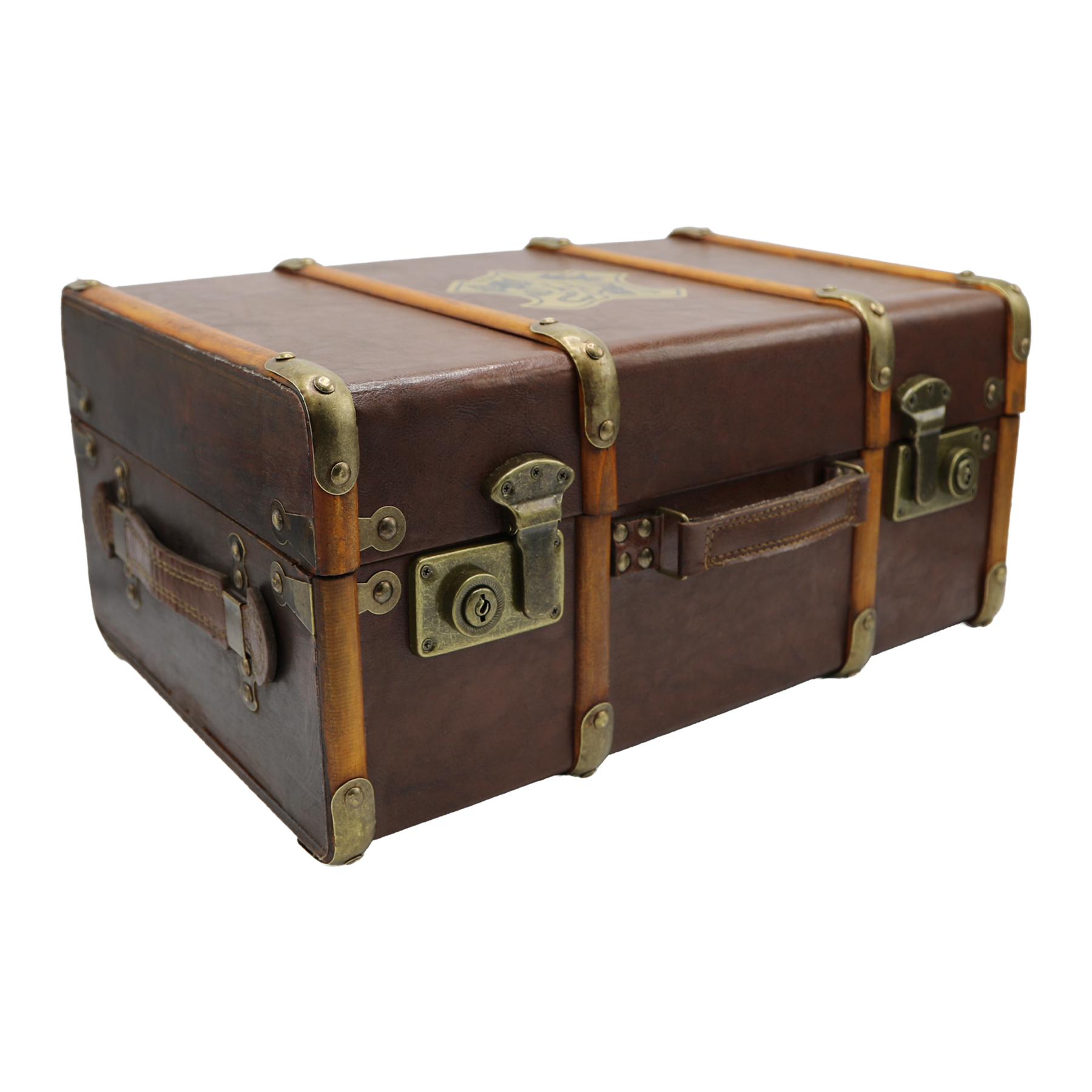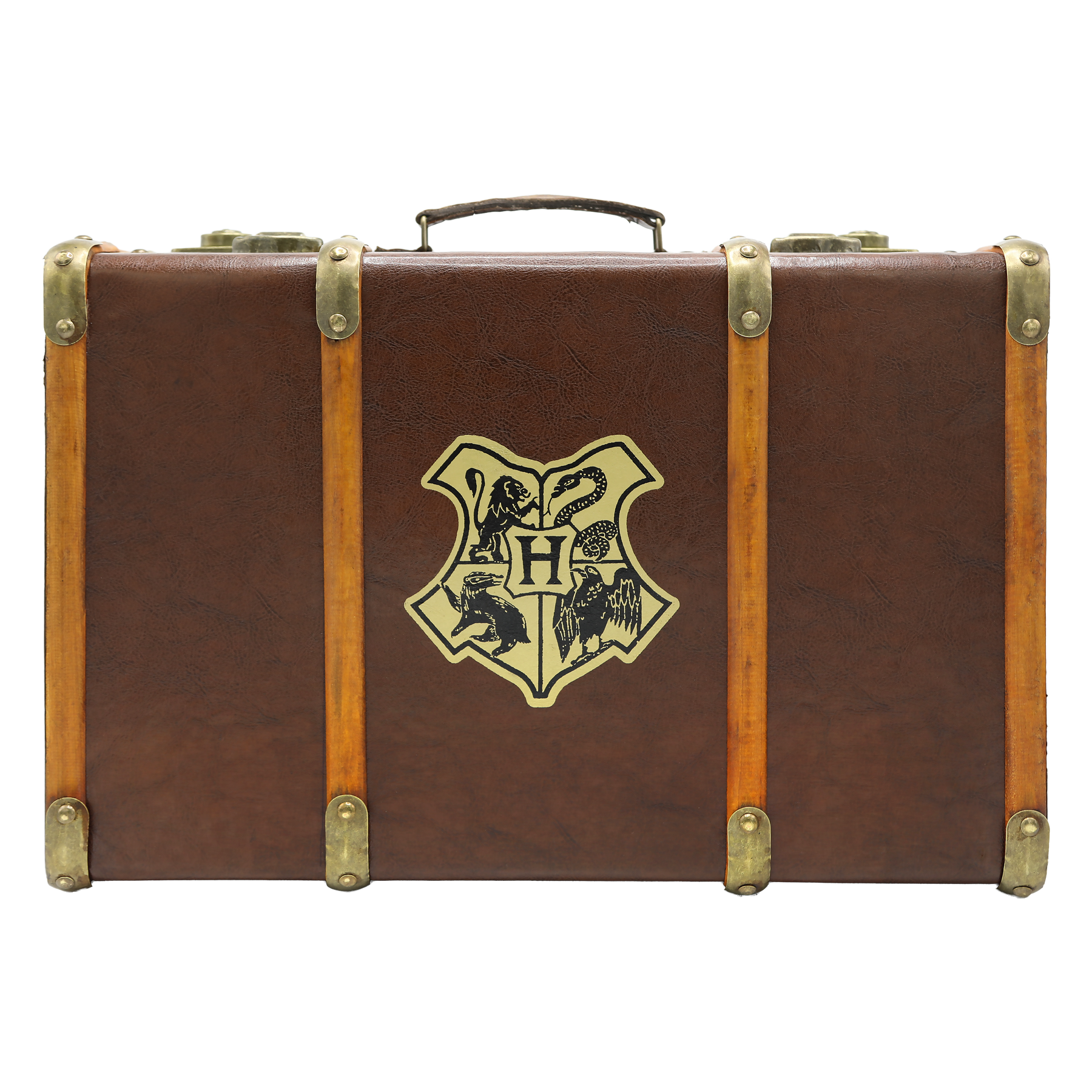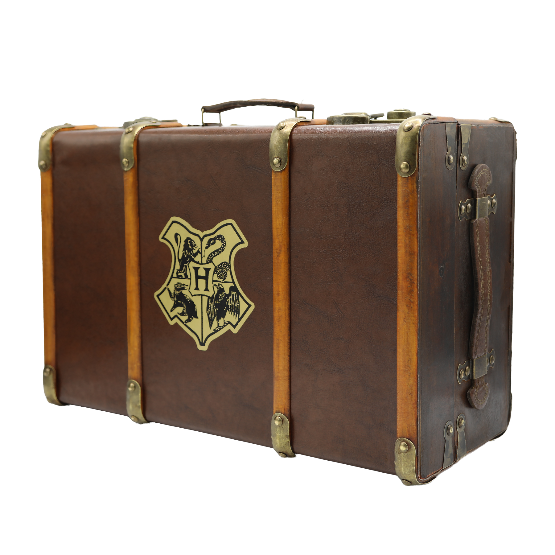 The Hogwarts Trunk measures 17.75" x 12.25" x 7.75" and features a carry handle and two key push locks. The Hogwarts school crest is printed on the top of the trunk, and custom initials can be added to the side.